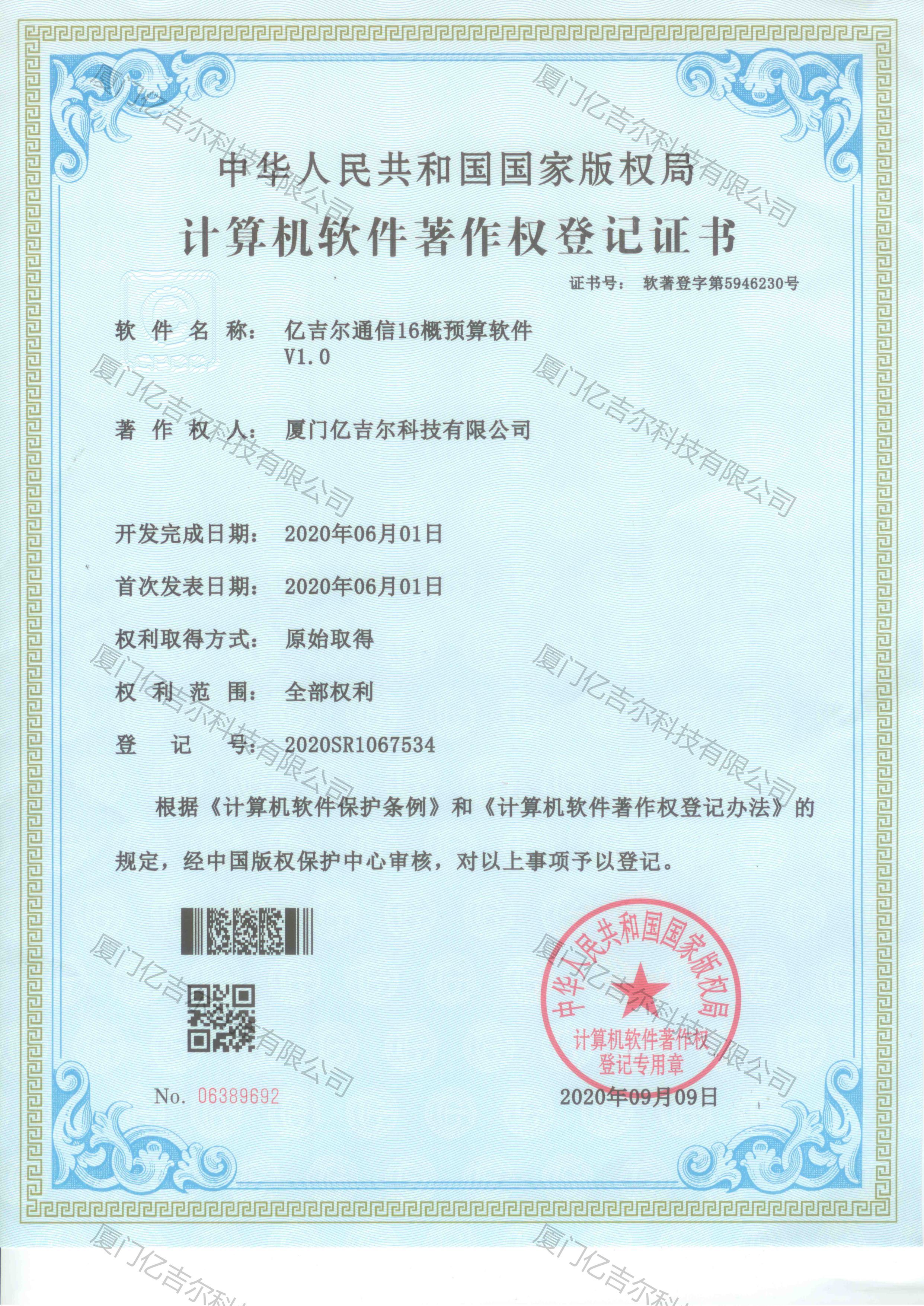 億吉爾通信16概預(yù)算軟件著作權(quán)登記證書 發(fā)布日期:2020年09月09日 瀏覽次數(shù):3795 關(guān)鍵字: 公司 1/1億吉爾通信16概預(yù)算軟件著作權(quán)登記證書